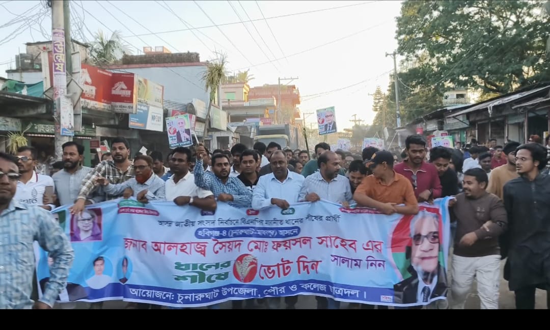 চুনারুঘাট প্রতিনিধি :হবিগঞ্জ-৪ (চুনারুঘাট–মাধবপুর) আসনে বিএনপির মনোনীত ধানের শীষের প্রার্থী আলহাজ্ব সৈয়দ মোঃ ফয়সলের প্রতি সমর্থন জানিয়ে চুনারুঘাটে উপজেলা, পৌর ও কলেজ ছাত্রদলের উদ্যোগে পথসভা, সমাবেশ ও মিছিল অনুষ্ঠিত হয়েছে। বুধবার (১৯ নভেম্বর) বিকালে অনুষ্ঠিত এই কর্মসূচিকে কেন্দ্র করে পৌরশহর জুড়ে বিরাজ করে উৎসবমুখর পরিবেশ। দলীয় নেতাকর্মীদের ঢল ও স্লোগানে মুখরিত হয়ে ওঠে পুরো এলাকা।