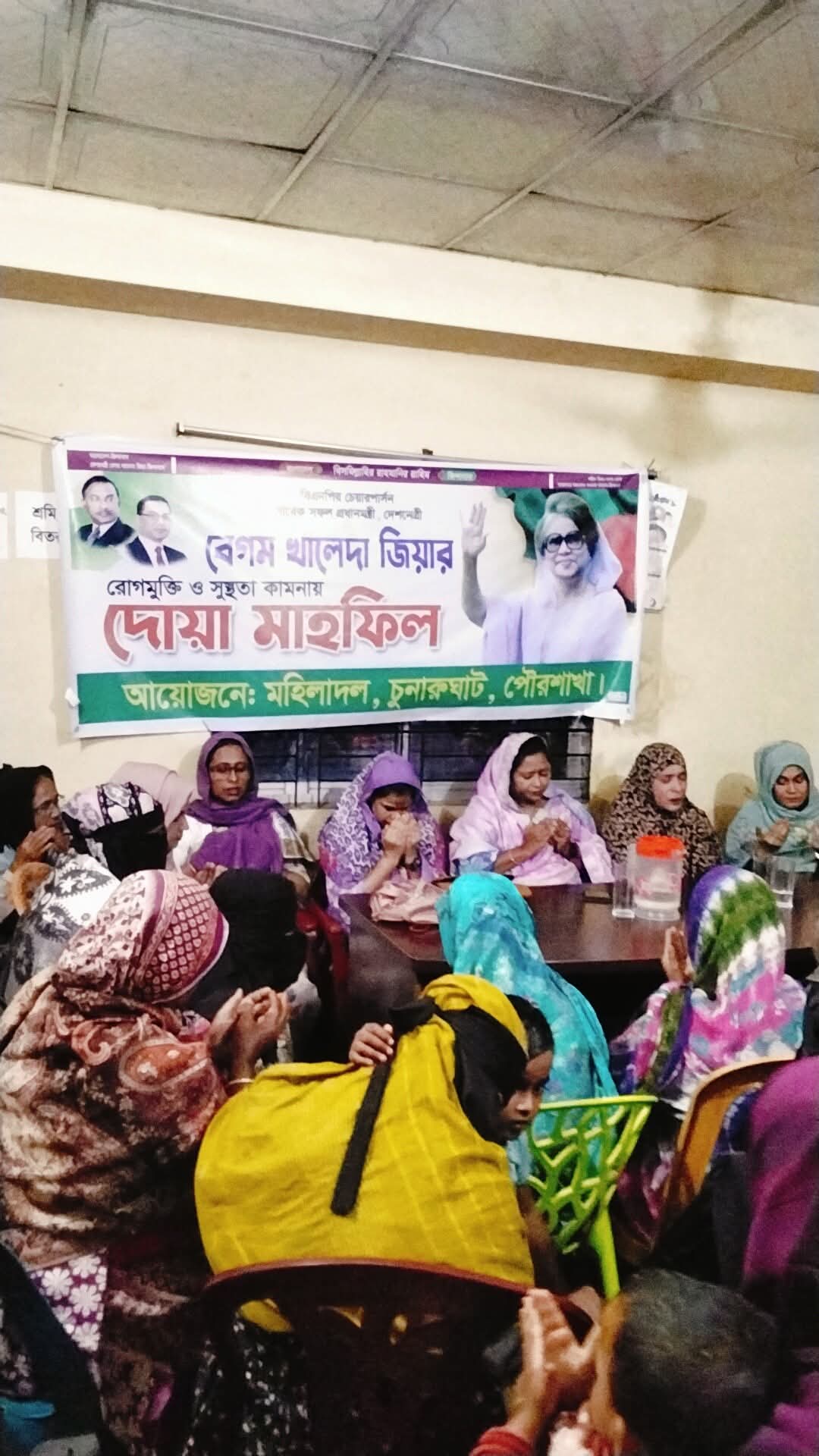চুনারুঘাট প্রতিনিধি ॥বিএনপির চেয়ারপারসন ও দেশনেত্রী বেগম খালেদা জিয়ার রোগমুক্তি ও দ্রুত সুস্থতা কামনায় চুনারুঘাট পৌর মহিলা দলের উদ্যোগে এক দোয়া মাহফিল অনুষ্ঠিত হয়েছে। রবিবার বিকেলে শহরের মুসলিম প্লাজার দ্বিতীয় তলায় আয়োজিত এ দোয়া মাহফিলে সভাপতিত্ব করেন পৌর মহিলা দলের আহ্বায়ক সেলিনা আক্তার এবং সঞ্চালনা করেন সদস্য সচিব রাফি আক্তার। উপস্থিত ছিলেন পৌর মহিলাদলের যুগ্ম আহ্বায়ক নাসরিন জাহান রুনা সহ অন্যান্য মহিলা দলের নেতৃবৃন্দ।