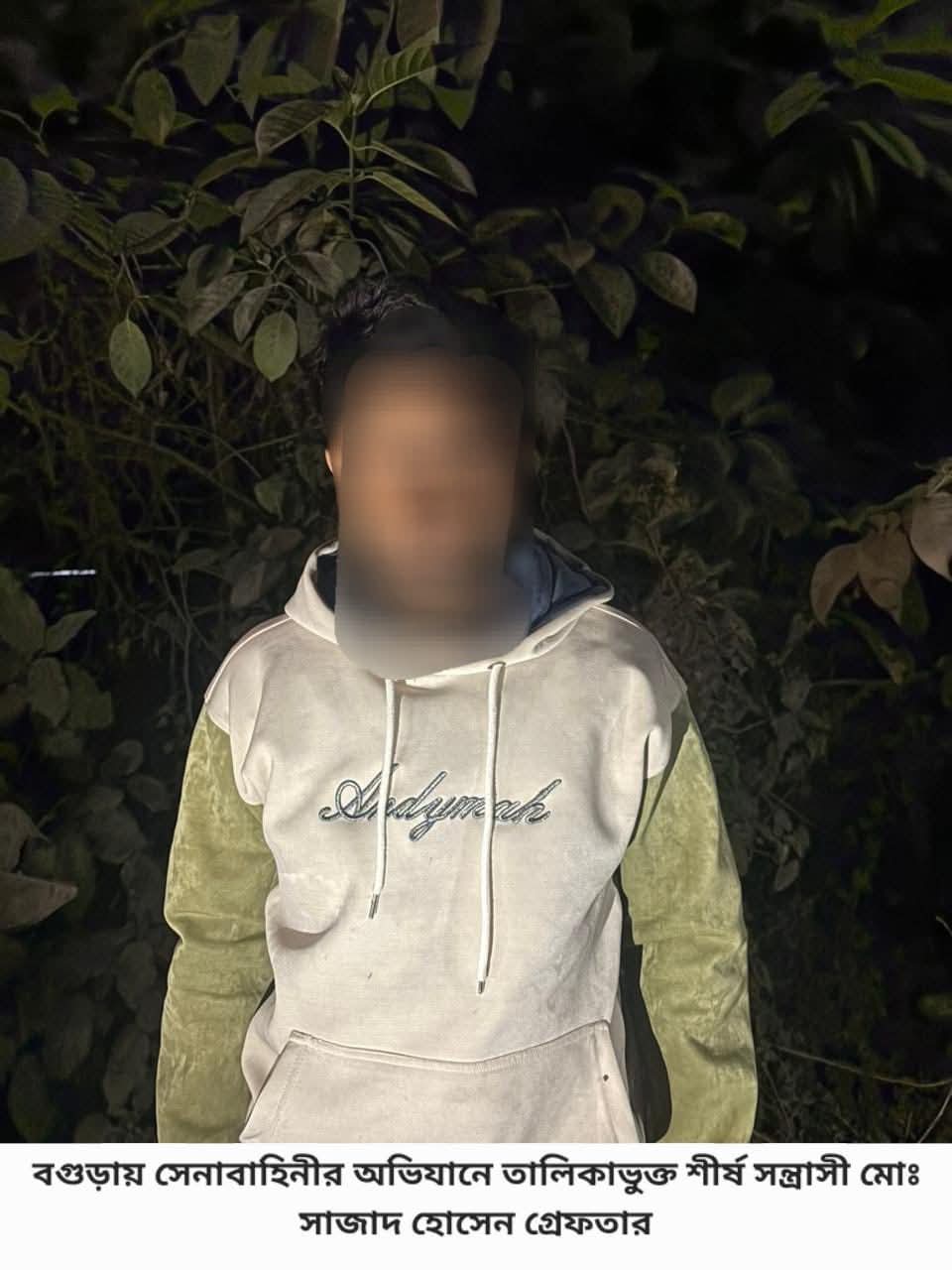 বগুড়ায় বাংলাদেশ সেনাবাহিনীর নেতৃত্বে পরিচালিত এক বিশেষ অভিযানে তালিকাভুক্ত শীর্ষ সন্ত্রাসী মোঃ সাজ্জাদ হোসেনকে গ্রেফতার করা হয়েছে। অভিযানে তার কাছ থেকে একটি বিদেশি পিস্তলসহ বিভিন্ন অস্ত্র ও সরঞ্জাম উদ্ধার করা হয়।