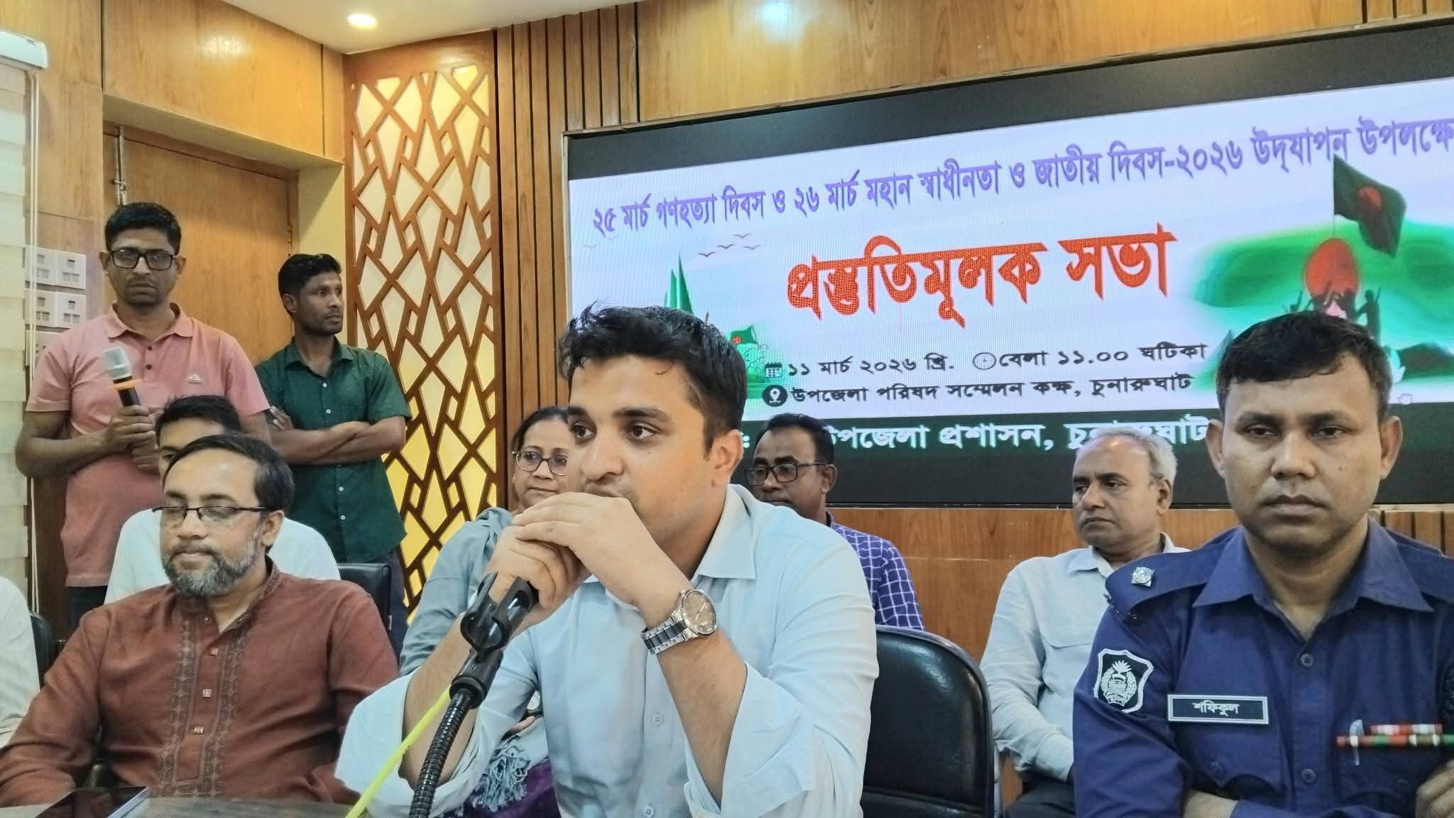 নোমান মিয়া, চুনারুঘাট (হবিগঞ্জ) প্রতিনিধি:হবিগঞ্জের চুনারুঘাটে আগামী ২৫ মার্চ গণহত্যা দিবস ও ২৬ মার্চ মহান স্বাধীনতা ও জাতীয় দিবস ২০২৬ যথাযোগ্য মর্যাদায় উদযাপন উপলক্ষে উপজেলা প্রশাসনের উদ্যোগে এক প্রস্তুতিমূলক সভা অনুষ্ঠিত হয়েছে।