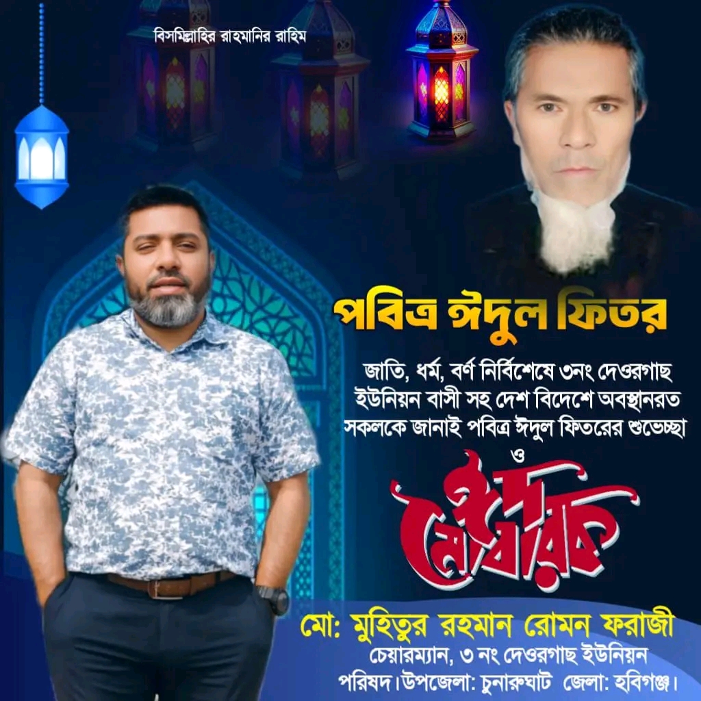 স্টাফ রিপোর্টার:পবিত্র ঈদুল ফিতর উপলক্ষে দেশ-বিদেশে অবস্থানরত সকল মুসলিম উম্মাহর প্রতি আন্তরিক শুভেচ্ছা ও মোবারকবাদ জানিয়েছেন দেওরগাছ ইউনিয়ন পরিষদের চেয়ারম্যান মোঃ মুহিতুর রহমান রোমান ফরাজী।